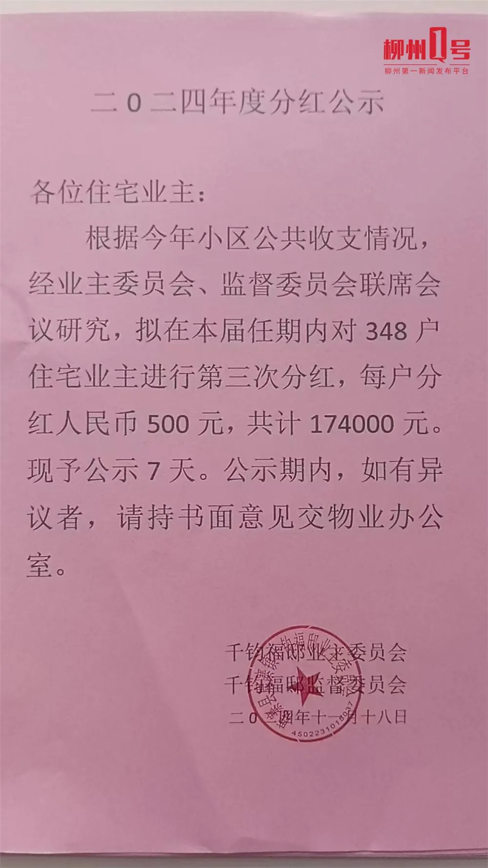 鹿寨县创业路千钧福邸小区业委会给业主分红(网友供图)