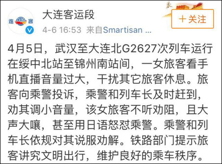 4月5日,武汉至大连北G2627次列车上,一女子在高铁上直播,音量过大,引发乘客投诉,乘警赶到后对该女子进行劝阻。谁知她非但不听,还飙起大段日语狂怼乘警,该女子的言语中透露其亲属是派出所的……其间还对着正在拍摄的旅客大呼:“全部干倒,来一个,倒一个;我要是有素质的人,就不坐高铁坐飞机了……”