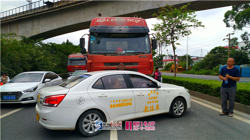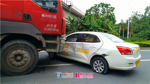 今天上午,柳太路上一辆大罐车在变道时没有留意,结果撞到同向行驶的教练车,在强大的冲击力下,导致教练车在路中打横。
