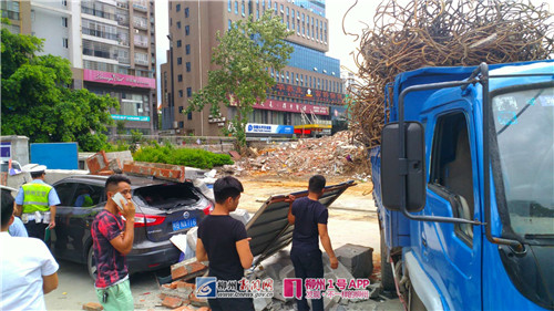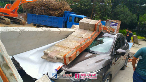 25日下午,在潭中立交桥旁一工地,一辆从工地拉废旧钢筋出来的货车,不慎撞对铁门,导致围墙倒塌,砸中停在围墙外的两辆车。