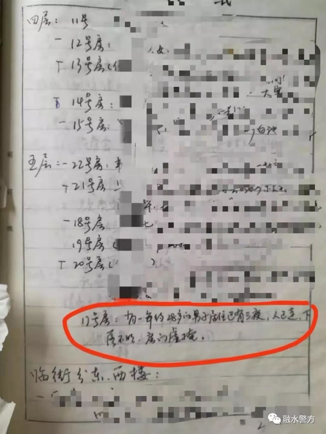 但办案民警没有放弃,他们昼夜奋战、持续攻坚,从近段时间入住的旅客入手,进行层层筛查,逐一走访当晚居住在该旅社的31名房客,重点调查当晚5楼案发现场的所有房客。同时组织精干警力对案发现场周边区域及各大咽喉要道开展摸排,大半个融水县遍布了办案侦查员的足迹。