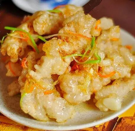 12)分次把肉炸好第一遍后油温继续加热至最高,油面完全平静,有少许烟冒起,将肉分次下入复炸,炸至有斑驳的焦红色捞出控油。(20秒左右)