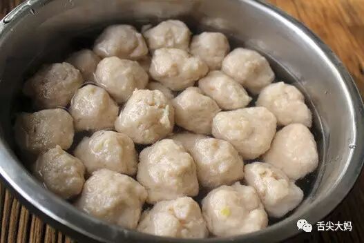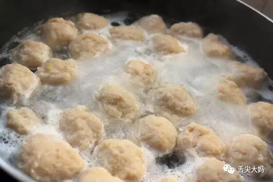 4、烧一锅水,水开后,小火。虎口挤出丸子,调羹沾水刮下来。丸子全部做好。熟透,有弹性后大火顶一下。