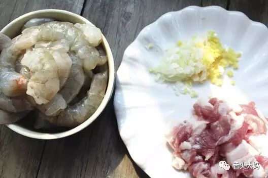 1、鲜虾去头去壳,用牙签去掉背上的虾线。五花肉切丁。葱姜切末。
