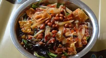 刮盆粉是融水特有的米粉之一,其做法是把米浆倒入尺许宽的圆形或方形的薄铁盘中,摊平;把铁盘放在沸水锅上,现蒸成一张薄薄的粉皮,然后用勺子“刮”入碗中,放入佐料、配菜、酱料、卤水即可。刮盆粉清香鲜嫩,吃时配上一两个铜瓢粑或者是烧炙,别有一番风味。