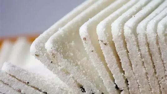 柳州云片糕历史久,名气大,传说多,比如“25片一扎,用手一甩,便像扇子一样散开”,再比如“用手捻可成圆筒,来回卷曲不断,点火尽燃之,进口即化”。柳州云片糕的特点是质地滋润细软,犹如凝脂,能久藏不硬。在制作上很为讲究,如炒糯米粉,一般要贮藏半年左右,以去其燥性;对绵白糖的选择也较严格;至于糕的切片要求也很高,每条糕块(长22厘米)一般要切140片左右。
