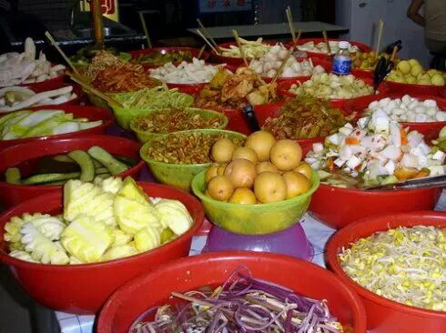 【酸】是采用木瓜、萝卜、黄瓜、莲藕、椰菜、菠萝等等你能想得出来的果蔬配以酸醋、辣椒、白糖等腌制而成。吃起来酸、甜、香、辣味味俱到,脆爽可口,生津开胃。